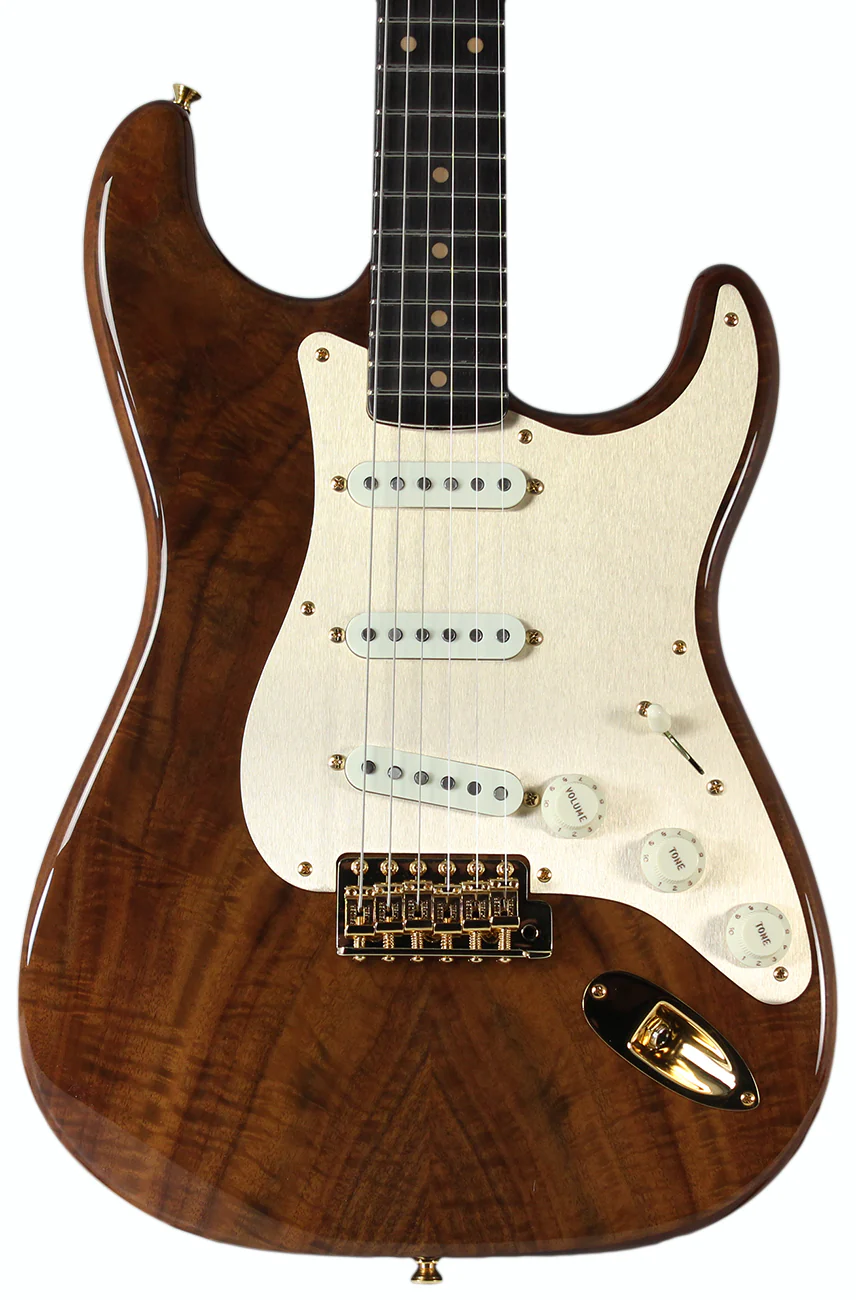 Alluringly warm-looking thanks to its mix of a roasted butternut body and claro walnut top, the Artisan Claro Walnut Strat effortlessly melds distinctively upscale looks with traditional Fender sound and design. A Fender Custom Shop original, crafted for the fearless player who’s eager to stand out on stage, this Strat is the pinnacle of elegance and playability.