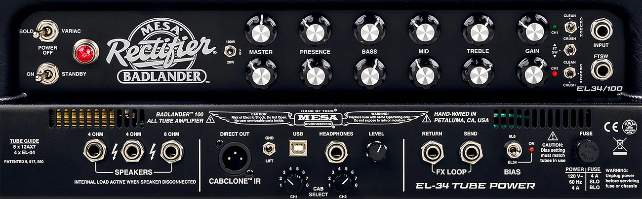 Here in the Badlander 50, the 2-Channel preamp hooks up with two different and perfect power displacements that enhance everything from clean to clipped to wildly saturated. The 50 Watt setting delivers bold authority and the highest headroom while the 20-watt setting finds the power tubes re-wired for Triode operation that unveils greater clipping potential and a mid-scooped, harmonic-laden response that reveals trademark EL34 Tone.
