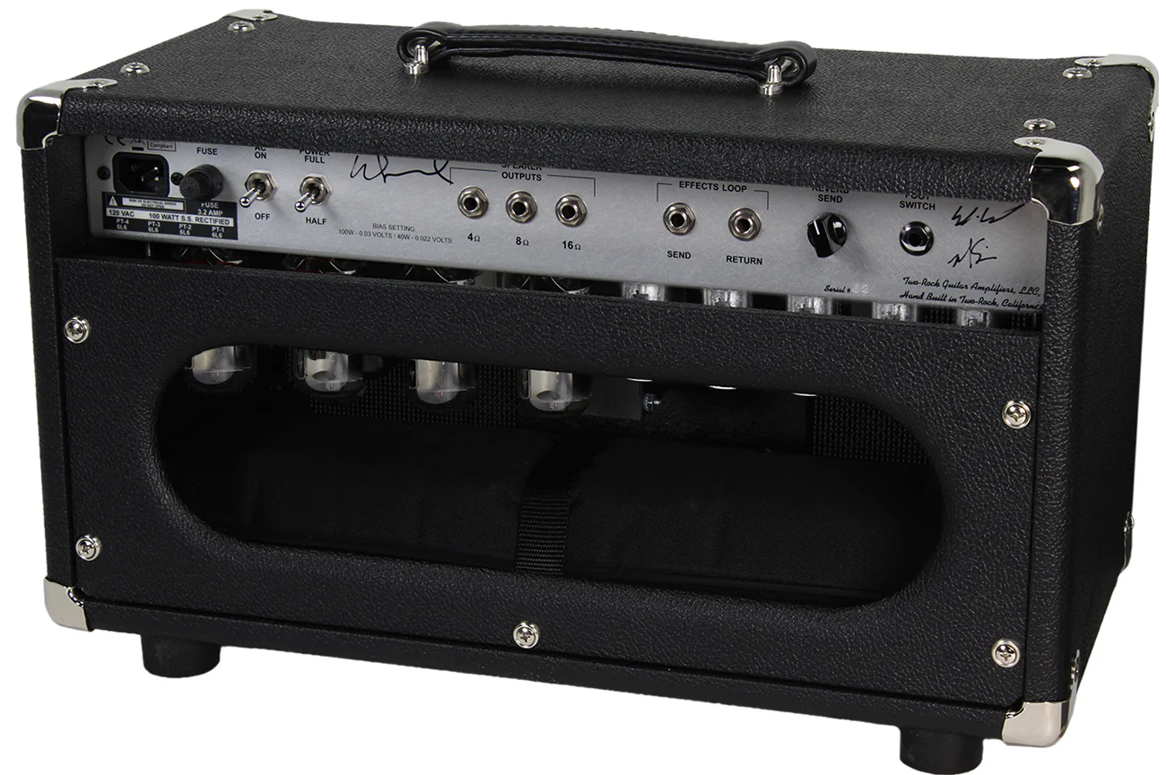 The Bloomfield Drive utilizes Two-Rock's new proprietary output transformers that allow for 4 x 6L6 power tubes switchable from 100 watts full output to a 50 watt output without any impedance mismatch or sacrifice of tone and feel. The responsiveness, depth and bandwidth of the clean channel is instantly familiar, and cascades to an articulate and touch dynamic lead channel that is a pleasure to play. As an extension of the clean channel, the new lead channel gives the player rich harmonics, added gain, and a beautiful sustain or add the foot-switchable tone stack bypass to either channel and push the amp to another dimension of overdrive tones. The Bloomfield Drive features a new sophisticated all tube spring reverb circuit specifically designed to not interfere with the overdrive channel and still retain clear note definition, a sweeter top end and maintain touch sensitivity when you push the gain. With a Send and Return control, you can shape your reverb to the room or vibe you are trying to achieve. In addition, the Bloomfield Drive features endless tone shaping options in the tone stack with toggle switches for added boost on the EQ and choice NOS part selections.