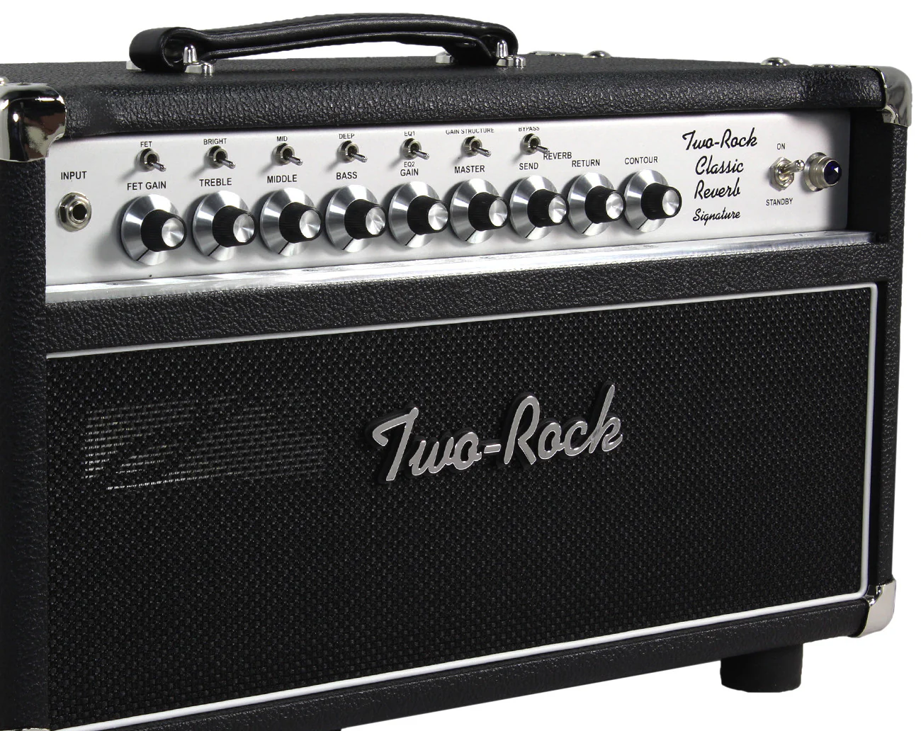 Using the Sterling Signature and John Mayer Signature amps as their guide, Two-Rock added a few features to enable the guitarist to tailor his clean from super squeaky hi-fi clean all the way to edgy, medium distortion. They're purposely tweaked the input stages to enhance distortion pedal performance. A sophisticated all tube spring reverb is included, featuring 3 voicings, plus individual send and return controls. The presence control has been eliminated and a contour control has been added. At the twelve o'clock position, the amp's frequency response is flat. Rotating the knob counter-clockwise, will decrease the highs and increase the lows, and vice-versa for clockwise movement. This is ideal for switching between single coils and humbuckers without touching other controls or compensating for different speaker cabinets. It's also a great way to compensate for room acoustics without changing your entire preamp EQ.