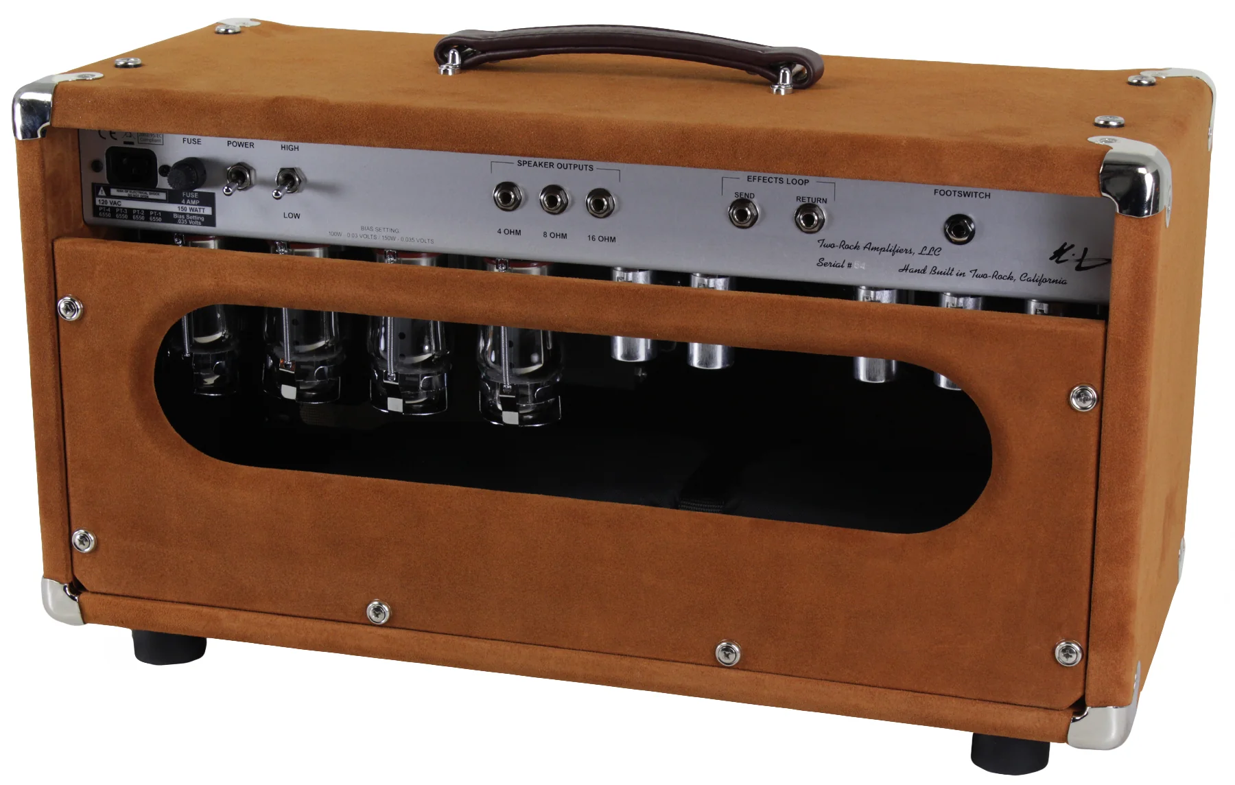 It's available in two versions, the 100 watt (4x6L6), and the 150 watt (4x6550). The 100 watt version is switchable to 50 watts, and the 150 watt 6550 model is switchable to 75 watts using Two-Rock’s proprietary output transformer design that allows zero performance loss when power scaling. There’s no doubt that this amp loves to be pushed to the limit, so the tone stack and the filter switches allow the user plenty of flexibility to find the right tone. 6 12AX7’s give this amp a lush reverb and a cathode follower tube that extends the punch and adds an immediacy to the feel as well as headroom and clarity.Â